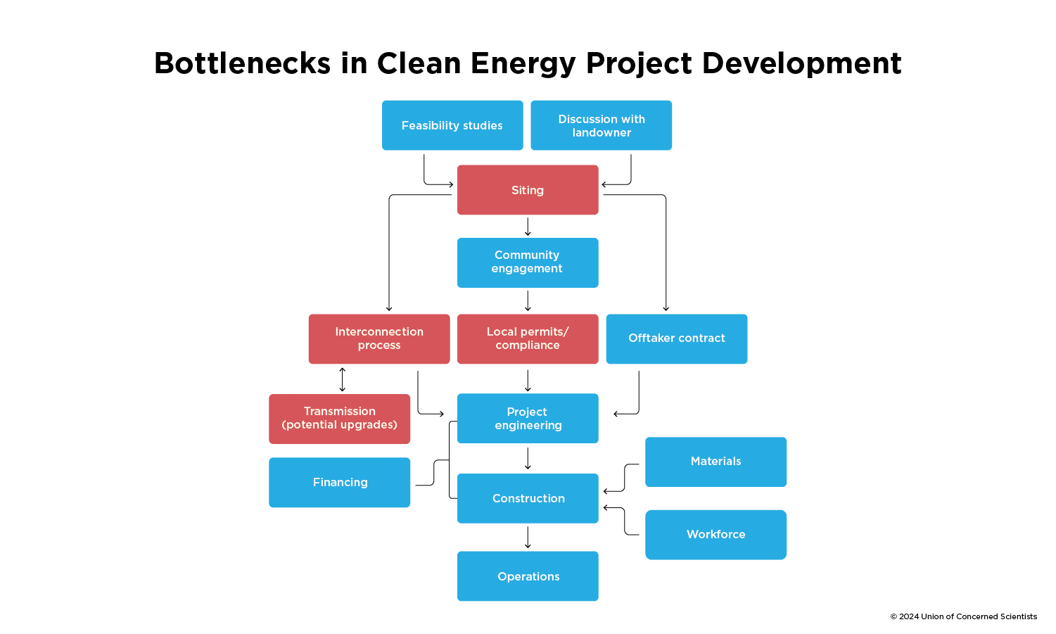 There are more than enough projects in the works to make that happen, but the state needs to address three bottlenecks that frequently delay project completion: the need for transmission and grid upgrades, the interconnection queue backlog, and siting and permitting difficulties.