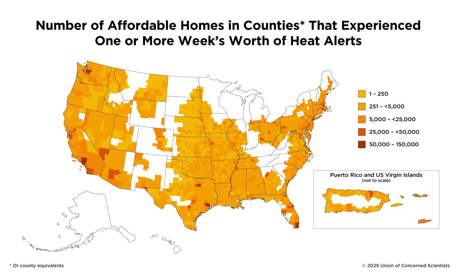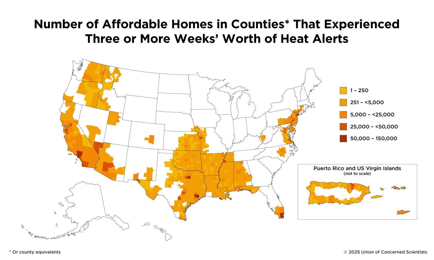 To assess this risk, the Union of Concerned Scientists analyzed the exposure of affordable housing to 2024 National Weather Service heat alerts across the United States, Puerto Rico, and the Virgin Islands. We found that people living in affordable housing experienced several days to several weeks’ worth of heat alerts each year, with households headed by people of color facing disproportionately high risks. The largest shares of affordable housing exposed are in the Northeast and Southeast, with Texas, California, and New York leading in numbers of homes exposed.